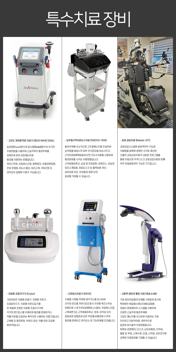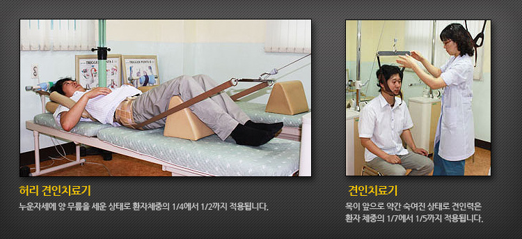 허리나 목의 디스크나 근육염좌, 척추관협착증, 퇴행성척추염 등의 증상에 적용되는 의료기기입니다. 척추사이 간격을 넓혀 신경근이 통과하는 추간공이 넓어지면 디스크에 걸린 압박이 풀리고 굽은 후방종인대가 펴지면서 디스크를 제자리로 밀어넣어 정복하게 되는 원리입니다.환부의 뭉친 근육의 경우에 늘여주면 긴장이 풀리고 이완됩니다.이러한 기전으로 허리나 목을 견인치료하며 적응증이 되는 대부분의 환자들이 팔 다리가 저리는 방사통이 사라지게 됩니다