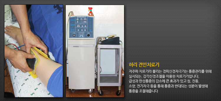 저주파 치료기라 불리는 경피신경자극기는 통증관리를 위해 실시되는, 감각신경조절을 이용한 치료기기입니다. 급성과 만성통증의 감소에 큰 효과가 있고 침, 진동, 소양, 전기자극 등을 통해 통증과 반대되는 성분이 발생해 통증을 조절해줍니다.