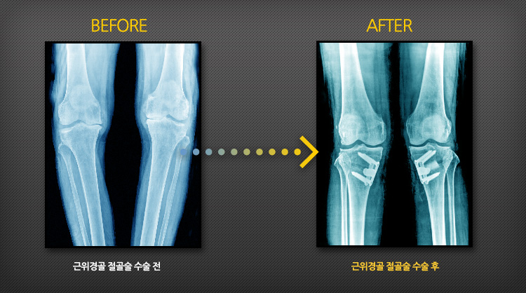 인공 슬(무릎)관절 치환술을 시행하지 않고도 자기관절을 10년가량 더 유지하면서 생활할 수 있으며, 수술이 비교적 간단하여 출혈, 통증이 적고 입원기간이 짧으며, 추후 퇴행성 관절염으로 진행시 인공관절로 전환이 가능합니다.