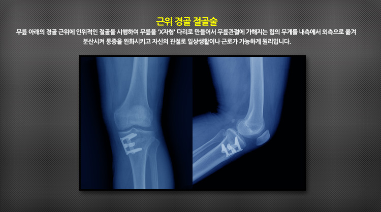 퇴행성 관절염으로 다리가 휘어진 내반변형(O자형)다리 환자들에게 절골술을 통하여 휜다리를 바르게 교정하여 관절염이 있는 슬(무릎)관절의 내측에 집중되어 있는 체중의 부하를 외측으로 분산시켜 통증을 감소시키기 위해 시행하는 수술법으로, 내반변형 정도가 심하고 슬(무릎)관절에 통증을 느끼는 비교적 젊은 환자(65세 이하)의 변형교정을 위해서 시행할 수 있는 수술방법입니다.